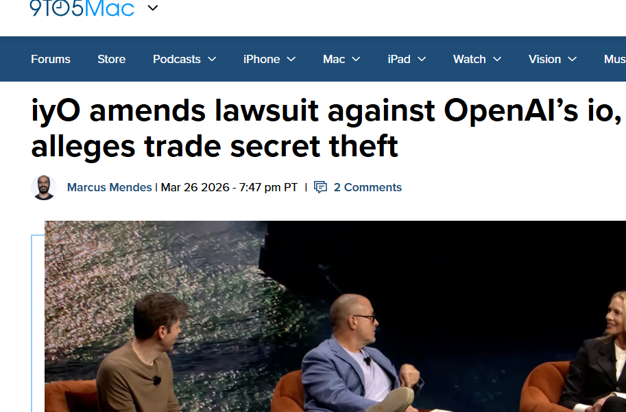 【各人网科技抽象报说念】3月28日音讯,据外媒9to5mac报说念,听力劝诱初创公司iyO日前修改了对OpenAI旗下io公司的诉讼,在原有商标侵权指控基础上,新增买卖微妙盗窃指控,将案件限度扩大,前苹果缠绵师、io衔尾独创东说念主唐·谭被列为新被告。