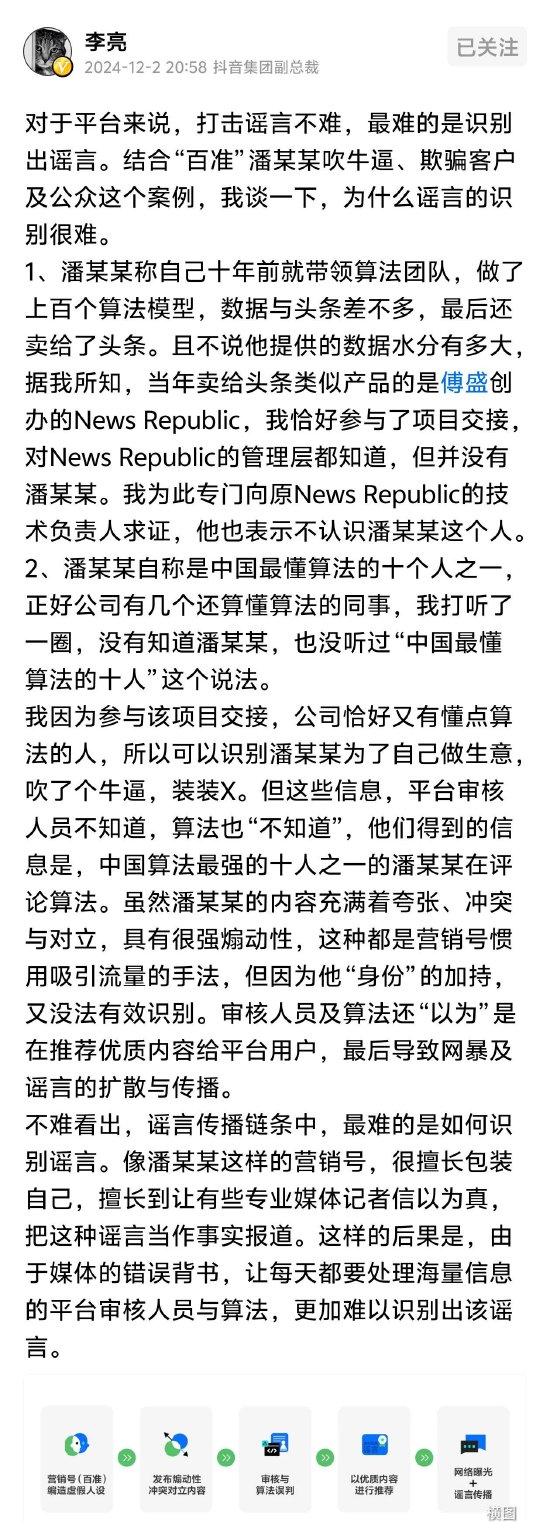 新浪科技讯 12月2日晚间音尘,抖音集团副总裁李亮在其个东说念主头条号上示意“关于平台来说,打击流言不难,最难的是识别出流言。”并示意开yun体育网,那些骨子充满着夸张、打破与对立,具有很强挑动性,齐是营销号习用蛊卦流量的手法,但因为发布骨子者的“身份”加合手,审核东说念主员及算法还“觉得”是在推选优质骨子给平台用户,临了导致网暴及流言的扩散与传播。”该骨子意在回话抖音平台网暴及流言扩散和传播的压根原因。