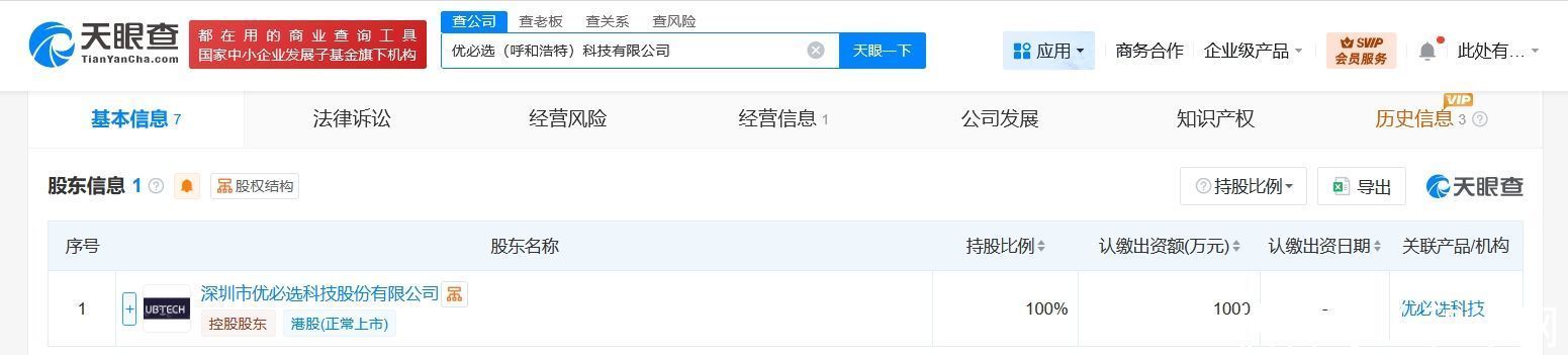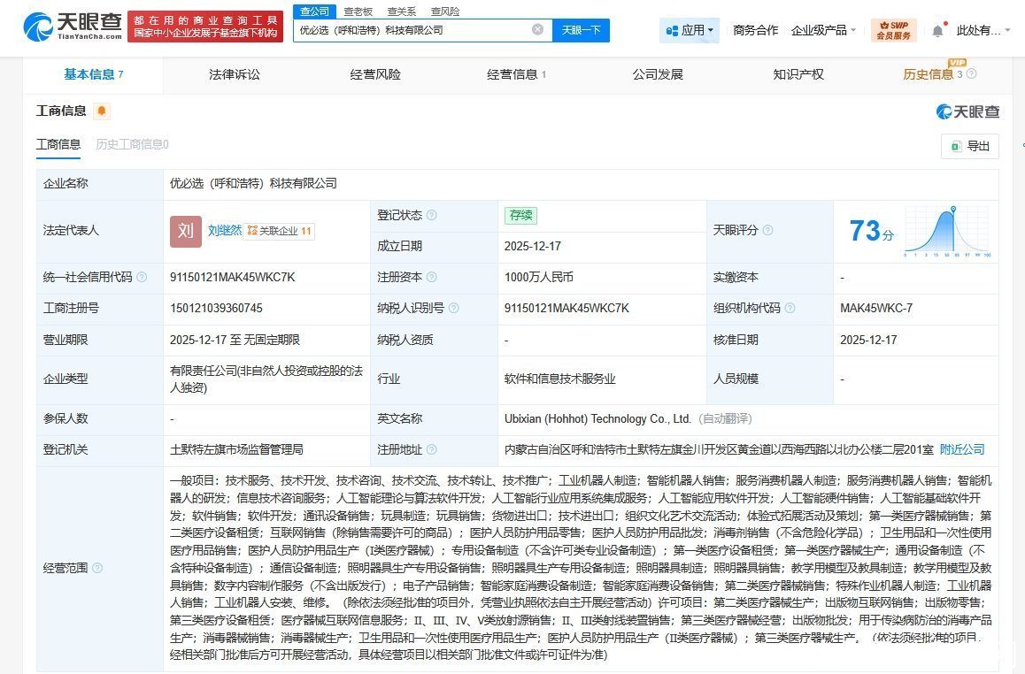 天眼查App清醒,近日,优必选(呼和浩特)科技有限公司建立,法定代表东说念主为刘继然,注册本钱1000万东说念主民币,筹谋鸿沟含工业机器东说念主制造、智能机器东说念主销售、作事破钞机器东说念主制造、智能机器东说念主的研发、信息工夫盘算推行为事、东说念主工智能表面与算法软件开发、东说念主工智能行业欺诈系统集成作事、东说念主工智能欺诈软件开发、通讯开辟制造等,由优必选(09880.HK)全资抓股。