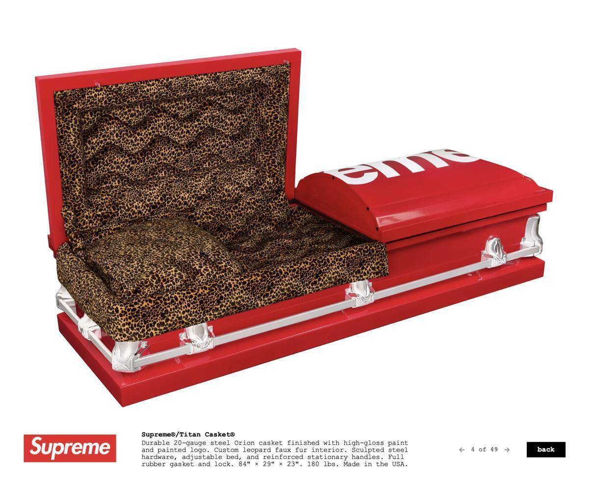 记者扫视到,除了这款“出圈”的棺材外,Supreme本季配件声势还包括20英尺拳击台、ATM机和发电机等奇特单品。