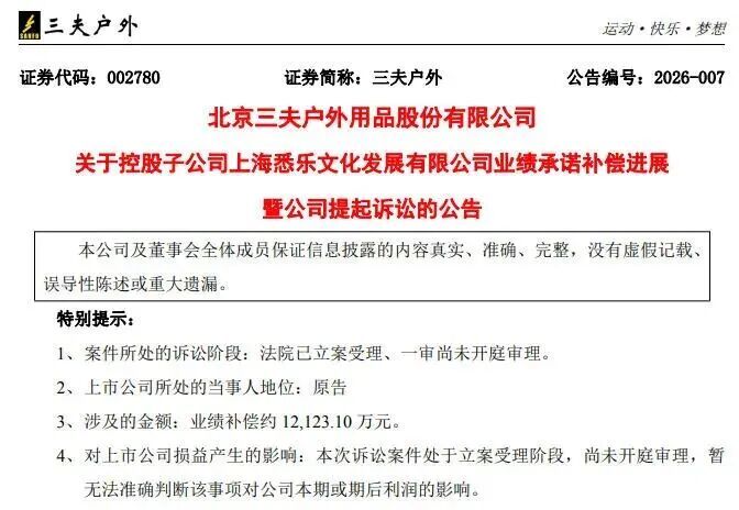 功绩快活失约,三夫户外追偿1.21亿投资赔偿
